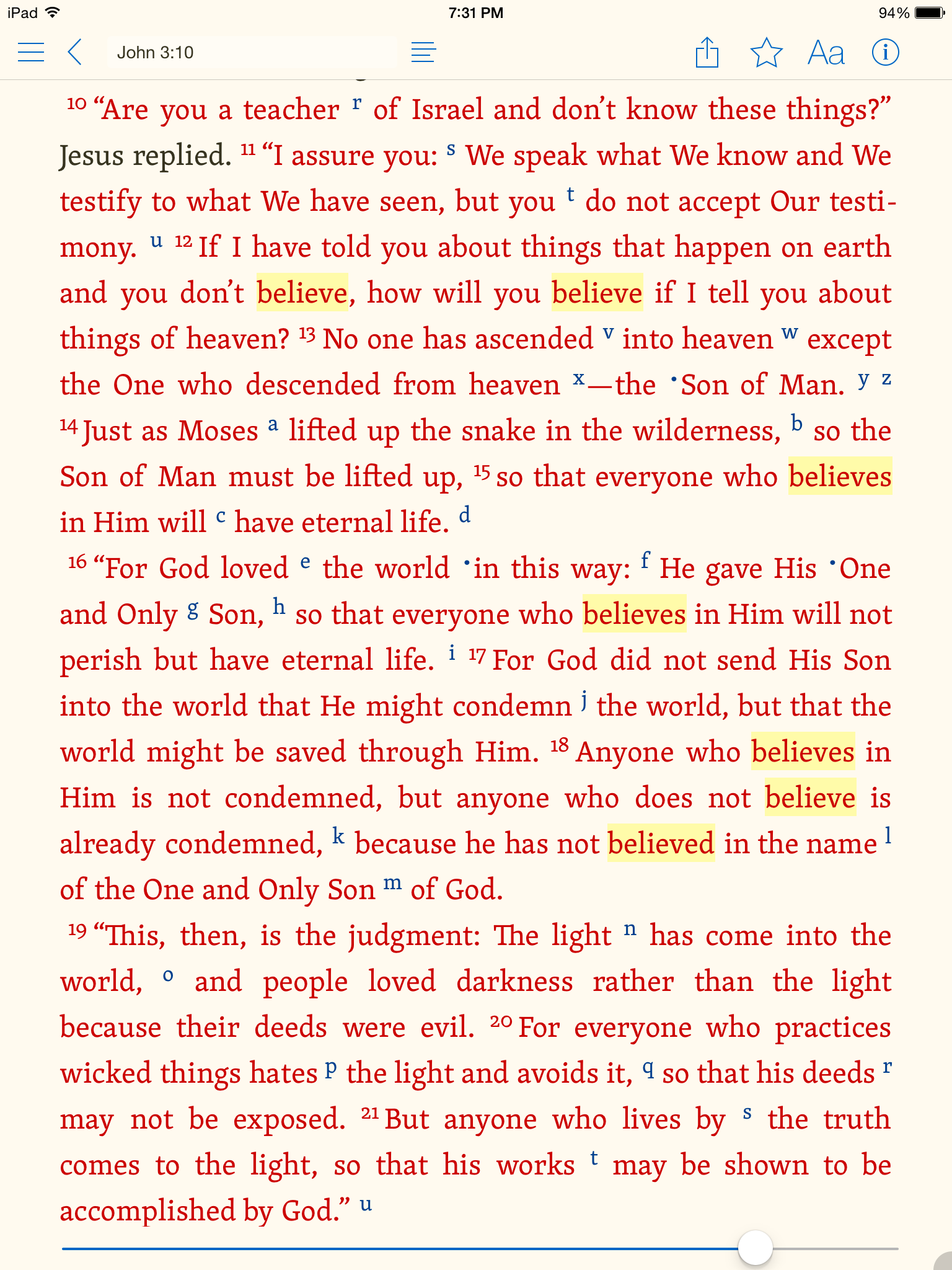 This week, use all the time you would normally take watching or reading the news, and instead, take the opportunity to read through the Gospel of John. And don’t just read through it, but take note as to how many times the word believe (or believes, belief, etc.) are used. And yes, I’m serious. Do your best to keep track of exactly how many times it’s used.
